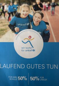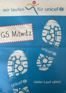 Die Kinder der 1. und 2. Klasse liefen mit großem Eifer mehrere Runden auf der 350m langen Strecke auf dem Schulgelände. Etwas später startete die 3. und 4. Jahrgangsstufe, welche ebenfalls viel Ausdauer und Engagement bewiesen. So konnte ein erfreuliches Ergebnis von 1327 Runden, das entspricht 464,45km, erzielt werden. Pro Runde spendeten die Eltern/Großeltern einen selbstgewählten Geldbetrag, der von der Schulleitung an UNICEF übergeben wird.